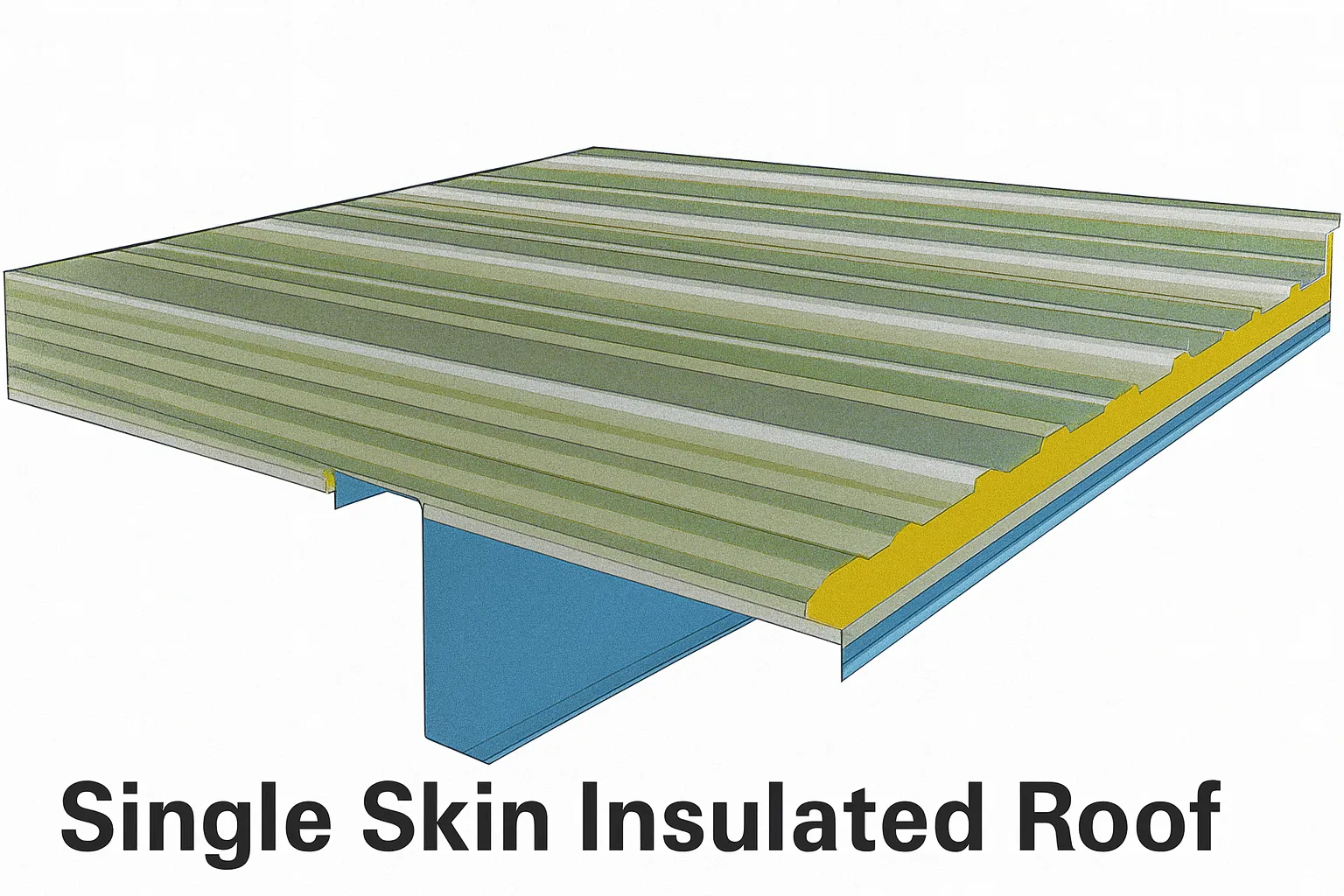 In single-skin insulation, the insulating material is installed directly under the roof or wall sheeting. The insulation is rolled over purlins or girts, and the sheeting is fixed through it onto the secondary framing. Only the vapour barrier layer is visible from inside, ensuring a neat appearance and effective thermal resistance.
