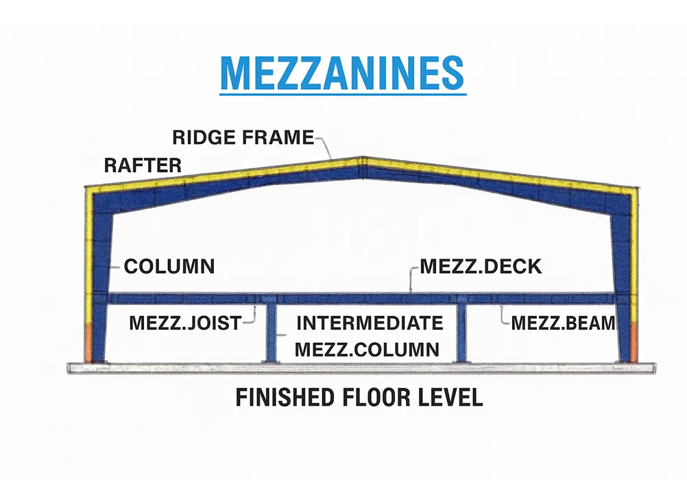 Joists: Run parallel to the building’s length, with their top flanges fitting just below the top flange of the mezzanine beams.
