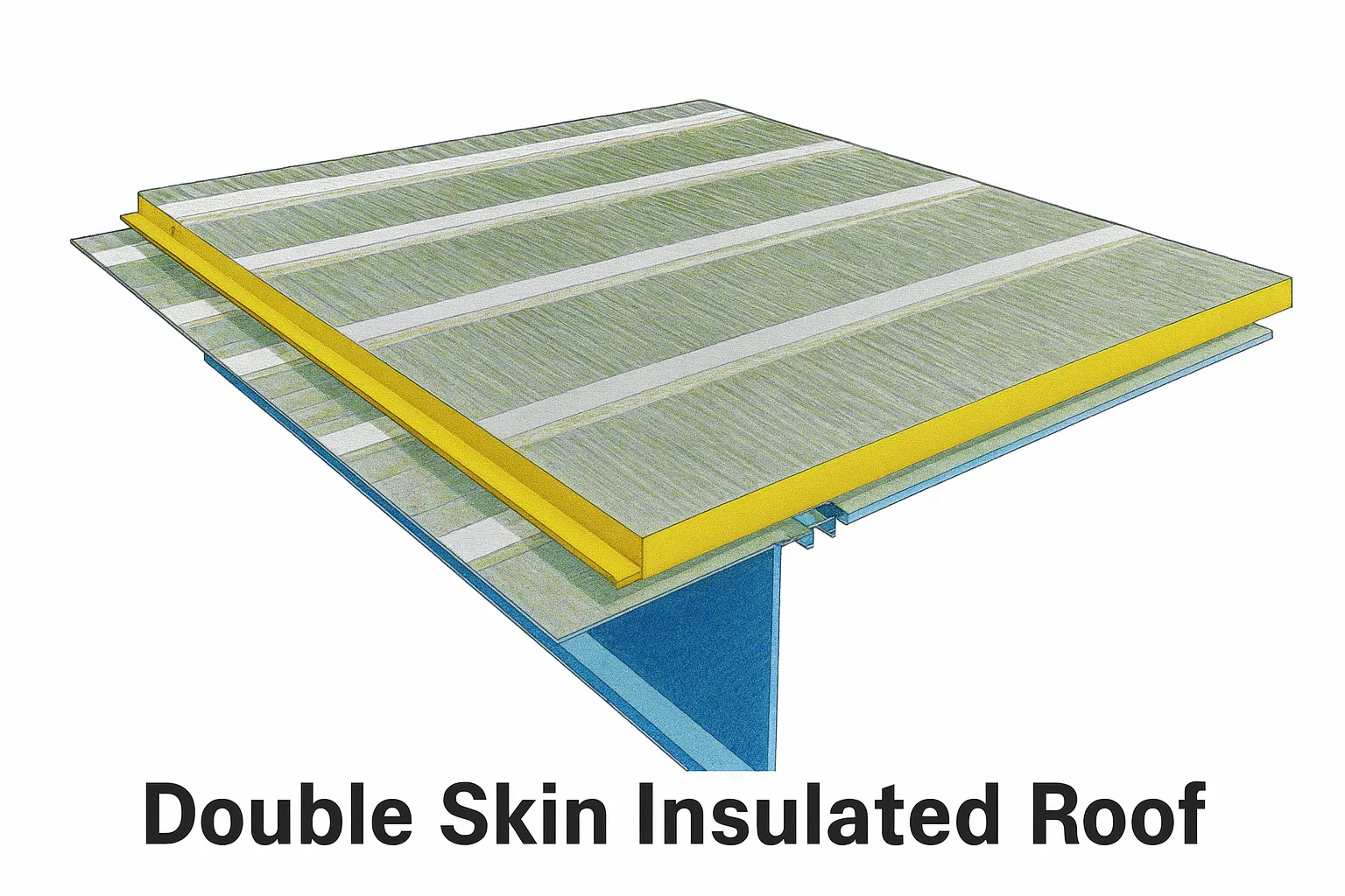 In double-skin insulation, the system consists of internal liner panels, spacer blocks, and outer sheets separated by an insulating layer such as Glasswool or Rockwool. This setup provides enhanced thermal insulation, soundproofing, and fire resistance while maintaining structural integrity. Double-skin wall cladding features an internal liner attached to girts and an external sheet fixed with insulation on the outside — delivering superior energy efficiency and comfort.
